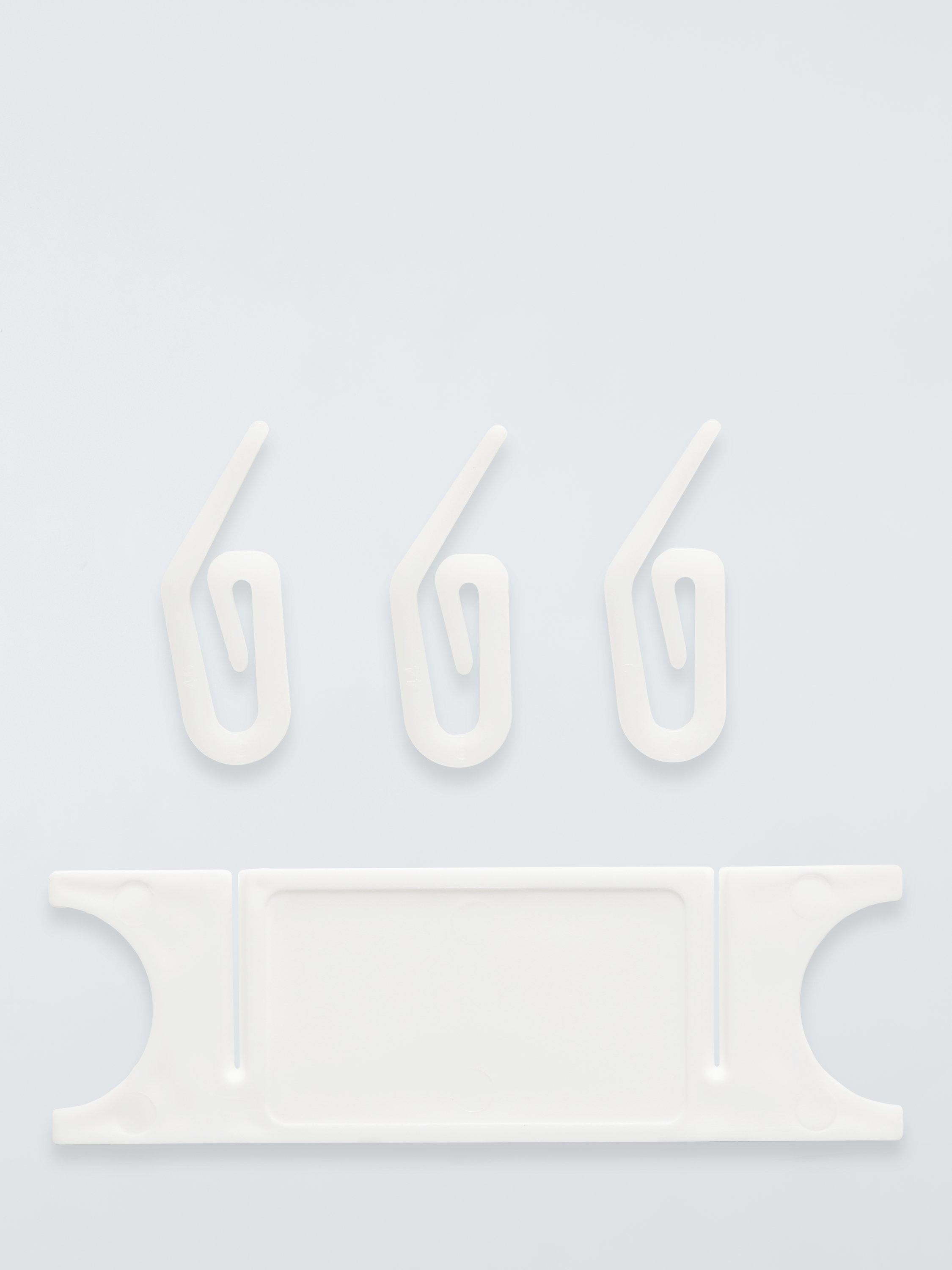 A pack of 50 standard curtain hooks and 2 plastic cord tidies.