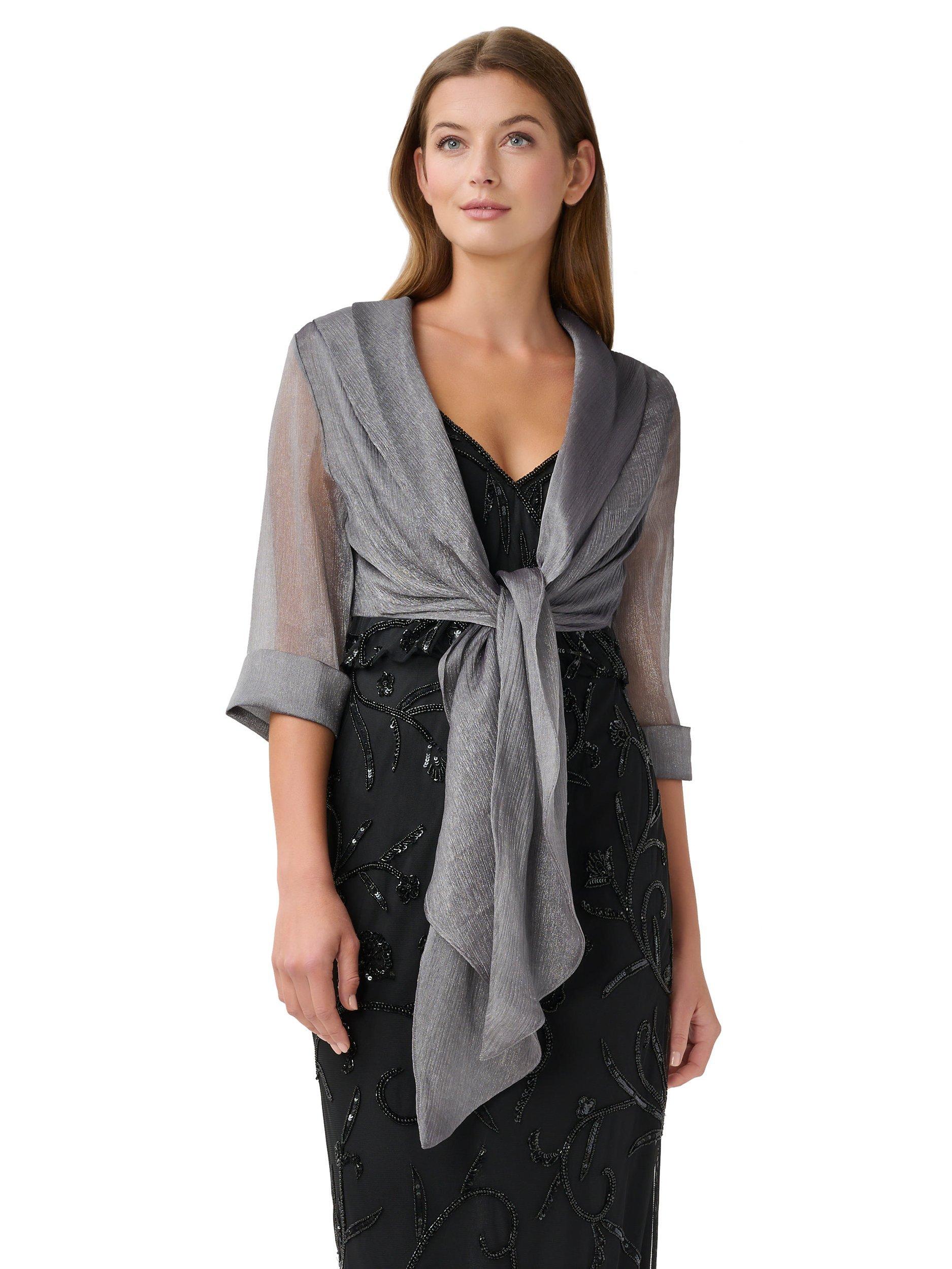 In a light organza material, this shawl from Adrianna Papell is a versatile piece that can be paired with anything from plain to patterned.