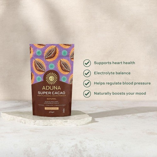 Aduna Super-Cacao is carefully crafted using selected, high-flavanol cacao beans blended with rich cocoa sourced from small-scale growers in Ghana. This superior formulation results in a powder that notably contains twice the flavanols found in regular cacao products. Experience the deep, luxurious flavour revered across the world for its recognised characteristics.