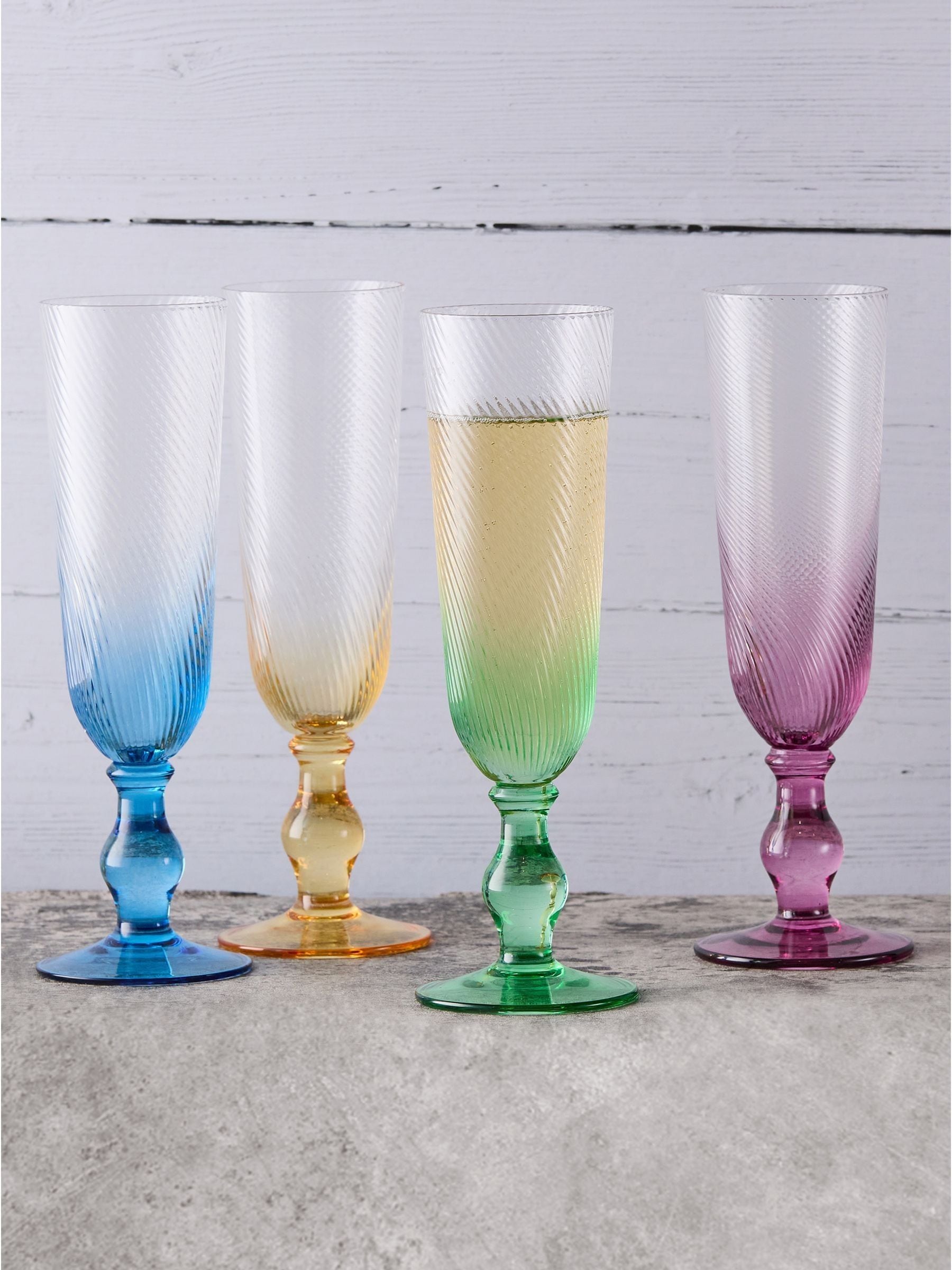 Swirl is a colourful, fun and eye-catching range by Anton Studio Designs. Each glass within this collection has a fresh ombre effect, with the colour fading as it rises up the glass. This look sits brilliantly with the shapely stem, and the mixture of tall, open bowls, all of which are neatly completed with a fine optic which flows around each bowl. Swirl is gift boxed as a harlequin set of four, and is available in four shapes – Flutes, Wines, Gins and Hiball Tumblers. - Detailed stem and fine, swirling optic on each glass - The colour fades as it rises up the glass, creating a fantastic ombre effect - Mouth blown and handmade by skilled craftsmen - Hand wash only - Designed in the UK