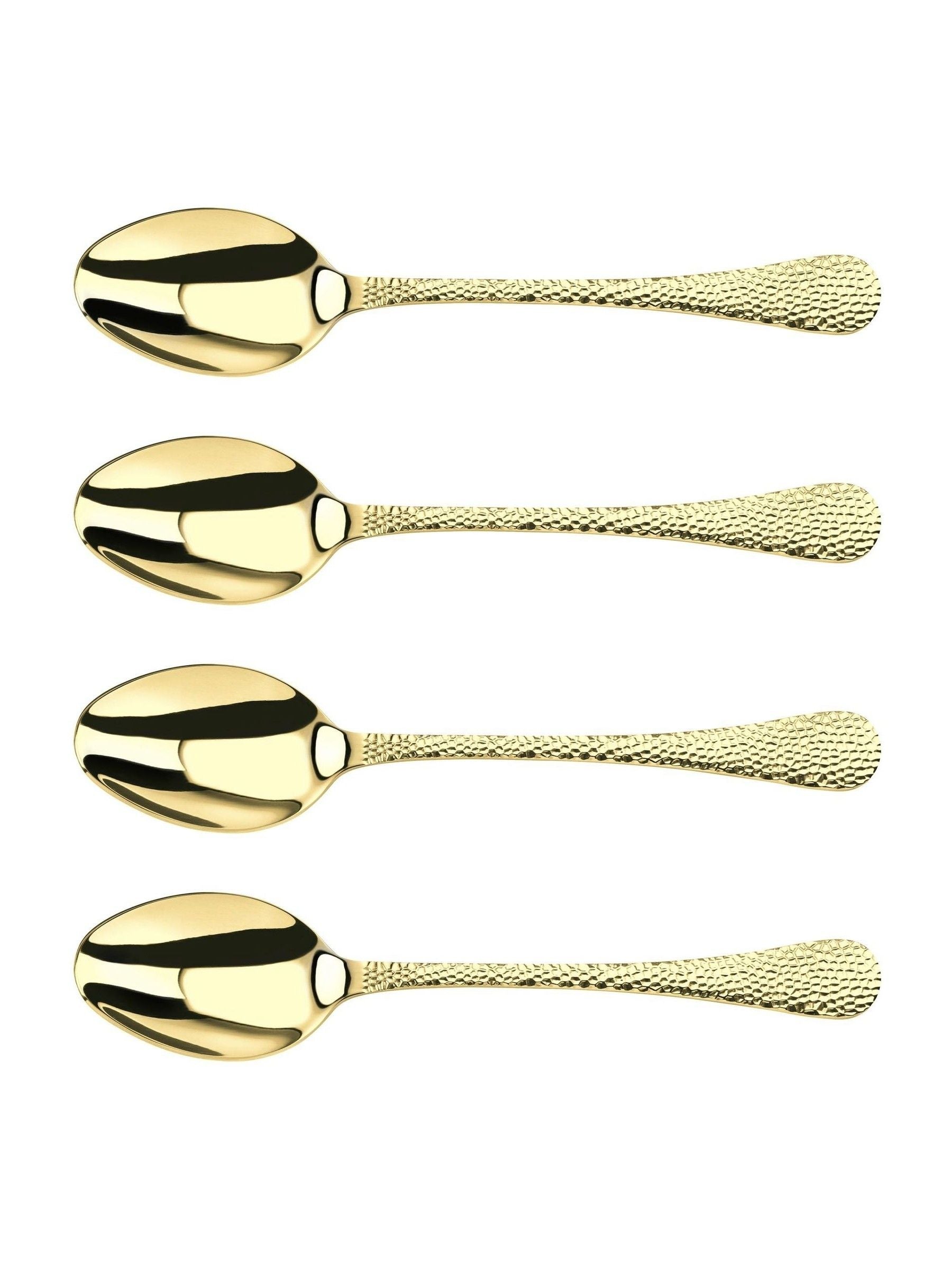 Champagne Avalon Set of 4 Serving Spoons. Champagne Avalon beautifully combines traditional and modern design elements. Each piece has a hammered textured finish to the handle, which adds interest and perfect for catching the light and adding glamour to any table setting. Produced from 18/10 stainless steel, dishwasher safe and 50 year guarantee. Single Item Weight - 63g Product Length - 20.5cm Box Weight: 485g Box Dimensions: Length - 23.5cm Width - 23.5cm Height - 3cm