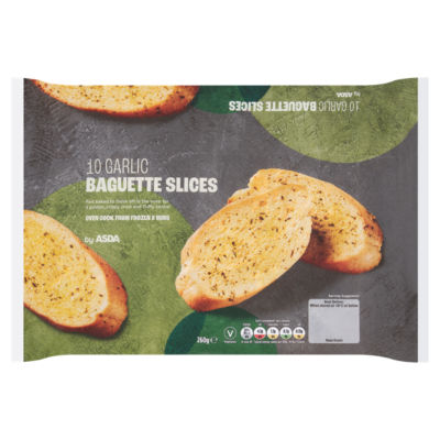 Enjoy these convenient ASDA Garlic Baguette Slices, ideal for quick meal additions or sharing occasions. Each pack contains 10 pre-sliced portions ready for baking.