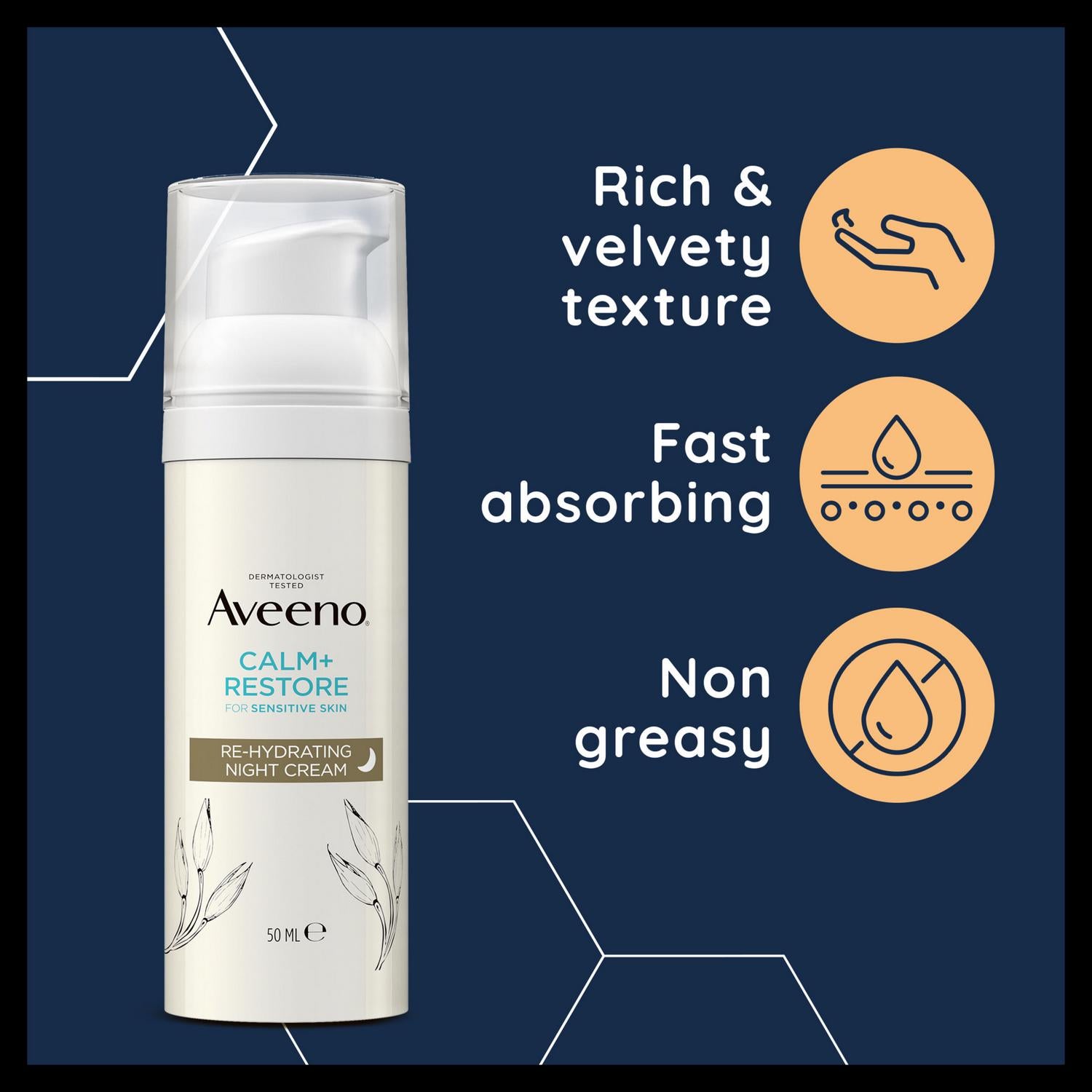 Read MoreIntensely nourish and strengthen the protective skin barrier overnight with Aveeno Face CALM+RESTORE® Re-Hydrating Night Cream. Formulated for sensitive skin, the rich and velvety texture night cream replenishes and nourishes the skin's moisture barrier as you sleep, for soothed skin in the morning. Non greasy and fast absorbing, it is clinically proven to nourish sensitive skin and helps to prevent skin de-hydration the next day with 48 hour moisturisation. The Re-Hydrating Night Cream is formulated with rich Shea Butter, and Mineral Complex known to increase the surface skin cell turnover*, leaving skin moisturised and healthy-looking. It contains Prebiotic Oats, known to help soothe and repair skin by restoring its moisture barrier, and Calming Feverfew, known for its antioxidant properties and for helping to calm skin. Clinically proven to nourish sensitive skin: formulated for sensitive skin, dermatologist tested, non-comedogenic, hypoallergenic**, and fragrance free. For normal to dry skin. * in vitro data **formulated to minimise the risk of allergies
