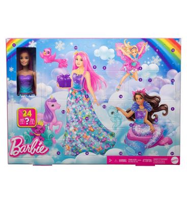 Read MoreAdd fantasy to the holidays with the Barbie Advent Calendar featuring fantasy-themed surprise gifts! Open one surprise a day for 24 days (or sometimes all at once!) for a super-fun unboxing experience. Kids will discover a pink-haired Barbie doll on the first day, and then fashion and storytelling accessories to transform her into a mermaid, a royal or a fairy as more are revealed! The daily gifts include a mermaid tail, fairy wings, baby unicorn and other magical pet friends, fantasy headbands and other fun items. With so many surprises, the Barbie Advent Calendar set makes a fantastical gift for kids ages 3 years old and up. Doll cannot stand alone. colourss and decorations may vary.