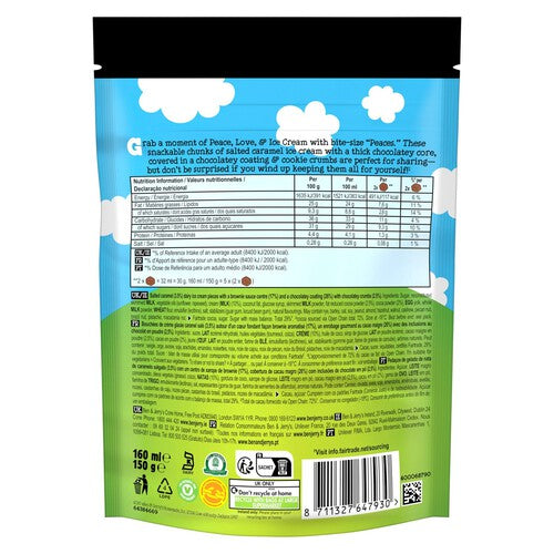 Ben & Jerry's Salted Caramel Brownie 'Peaces' 10MP, Mini Salted Caramel Ice Cream 'Peaces' with a Thick Chocolatey Core, Coating & Crumbs, Only have a minute to get your ice cream fix? Salted Caramel Brownie “Peaces” were made for this snacking moment, Ice Cream made with Fairtrade certified sugar, vanilla and cocoa and open chain Cocoa, Kosher, Halal & Vegetarian, Open Chain certified ice cream, Ben & Jerry's Peaces come in a pouch - perfect for sharing!