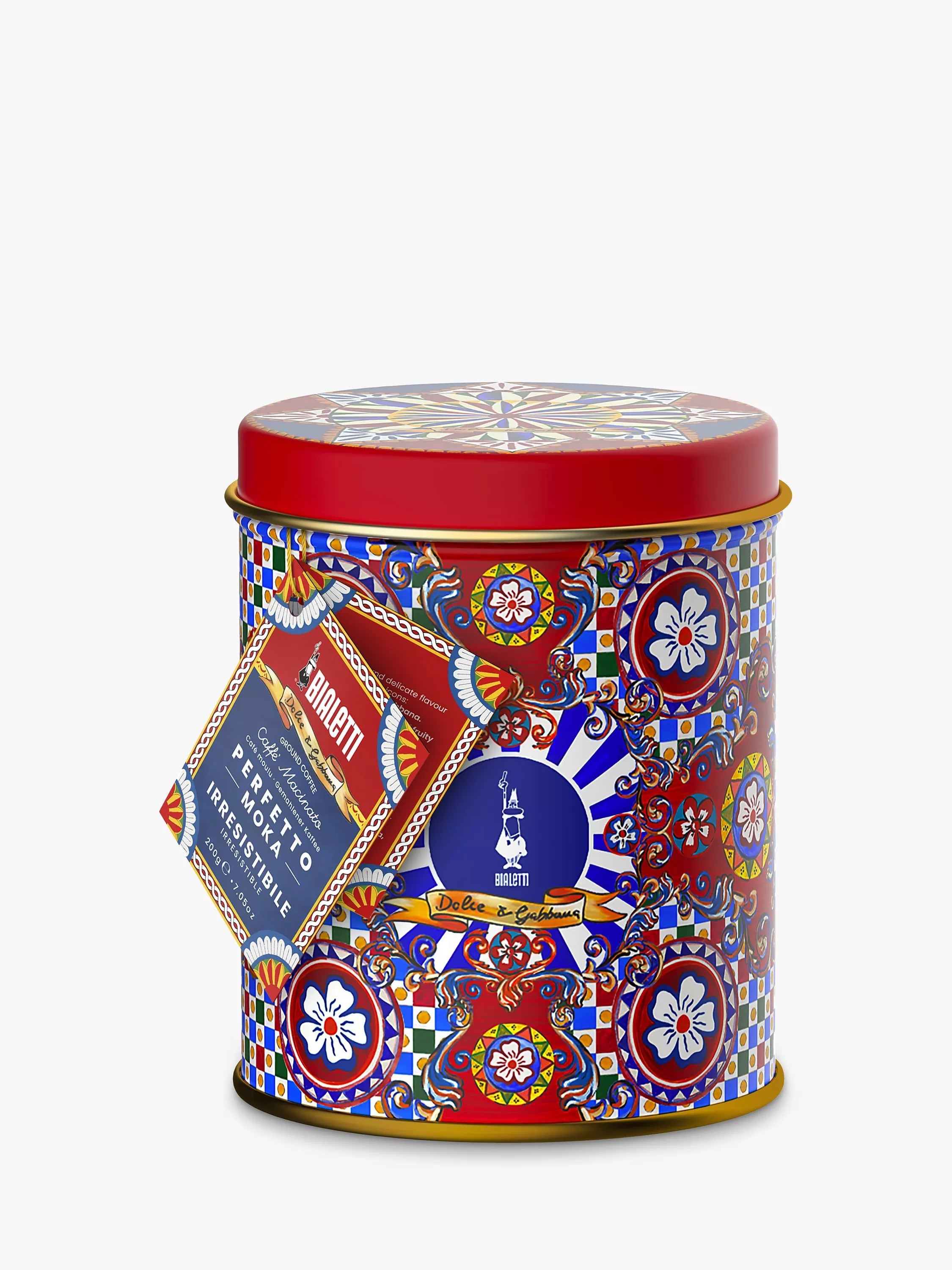 Two icons of Italian design together. Bialetti has teamed up with Dolce & Gabbana for a coffee collaboration. The design on this coffee tin is inspired by colourful painted Sicilian market carts and it features a l'Omino (the little man) cutout, recognised as Bialetti's original symbol of quality and authenticity.