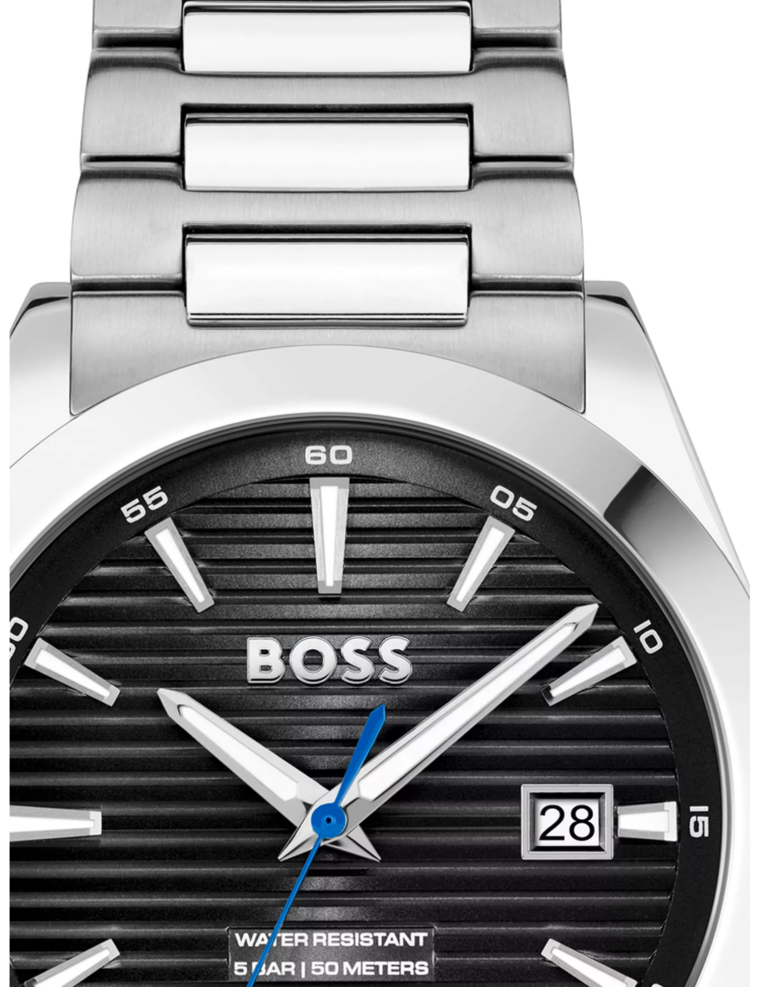 From BOSS's Strike family, this watch features a 41mm stainless steel case with a three-hand movement and is secured with a stainless steel bracelet strap. Water resistant to 50m.