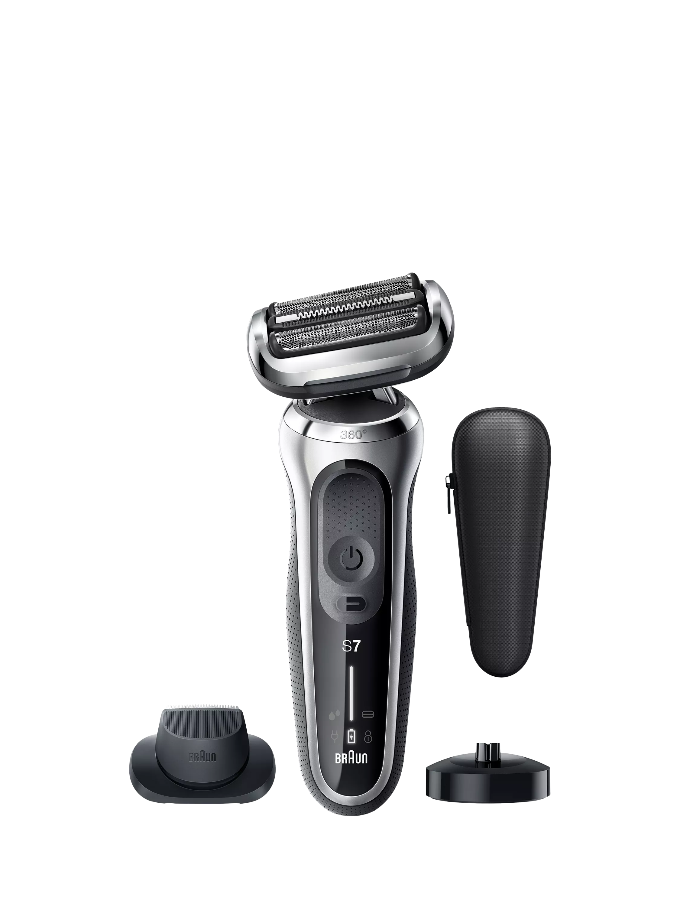 The Braun Series 7 electric shaver for men with 360° adaptation for a smooth shave. Features Autosense technology that reads and adapts to your beard density, removing more hairs in every stroke. The Li-Ion Battery provides up to 3 weeks of shaving and a 5 min quick charge. This men's electric razor is 100% waterproof for Wet & Dry use. Compatible with EasyClick system. Precision Trimmer attachment included. Box includes: 1x Series 7 Electric razor for men - Silver 1x Precision Trimmer attachment 1x Charging Stand 1x Travel case 1x Smart plug for automatic 100-240 voltage adjustment 1x Cleaning Brush
