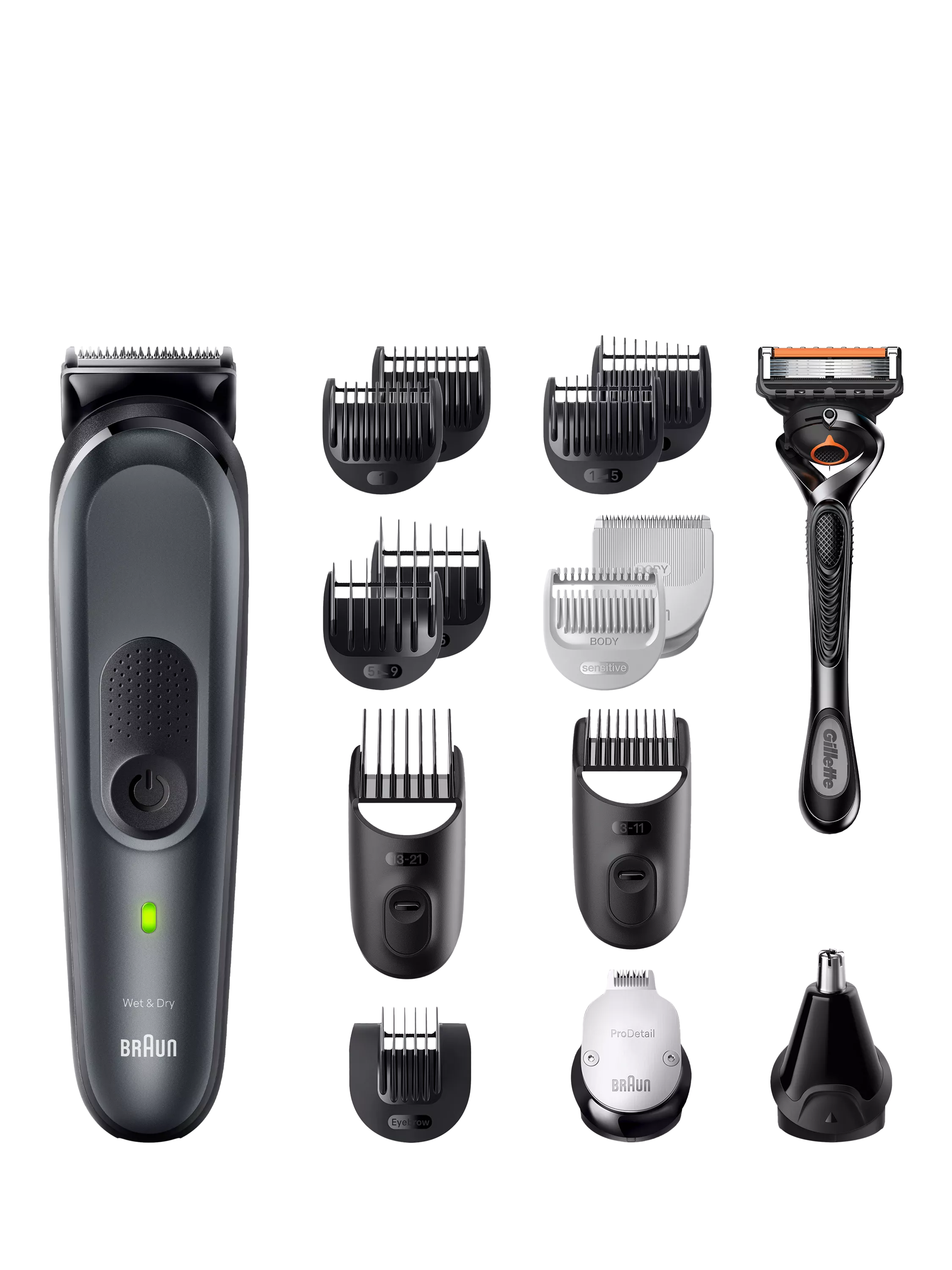 Box Content: 1x Trimmer device 1x ProBlade trimmer head 1x Body groomer head 1x Detail trimmer head 1x Ear & nose trimmer head 1x Sliding beard comb (3 - 11 mm) 1x Sliding hair comb (13 - 21 mm) 1x Standard fix comb (1 mm) 1x Standard Fix comb (2 mm) 1x Beard fading comb 1x Hair fading comb 1x Sensitive comb 1x Eyebrow comb 1x Gillette Proglide razor 1x Gillette Proglide cartridge 1x Cleaning brush 1x Charging stand 1x Organizer case.