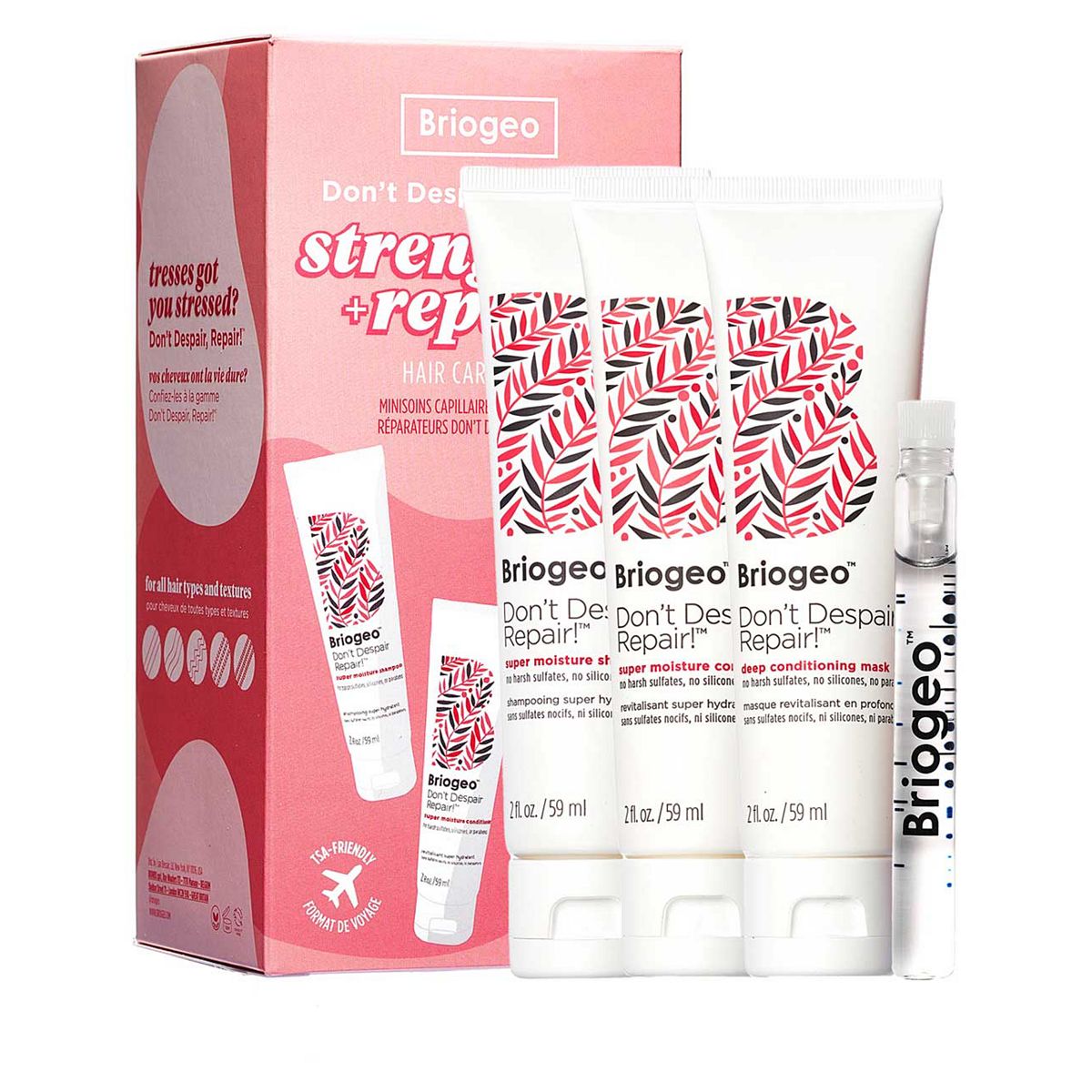 Healthy hair on the go! This kit of deluxe minis contains everything you need to strengthen and repair dry, damaged strands. At work are fortifying ingredients like ceramides, rosehip oil, almond oil, algae extract, and B vitamins.