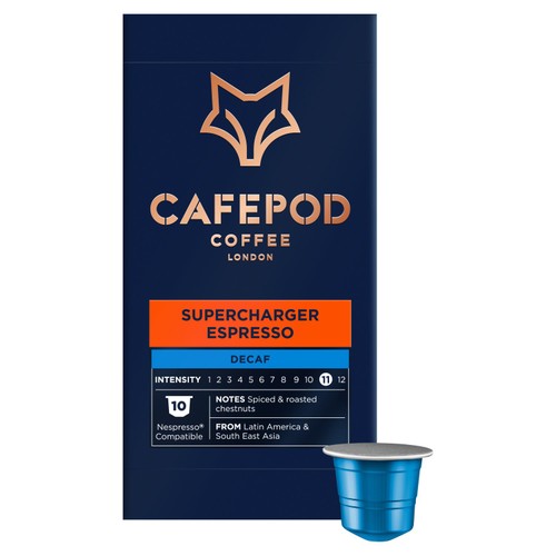 10 Sluminium pods compatible with Nespresso* Original system. Contains roasted ground decaffeinated coffee.