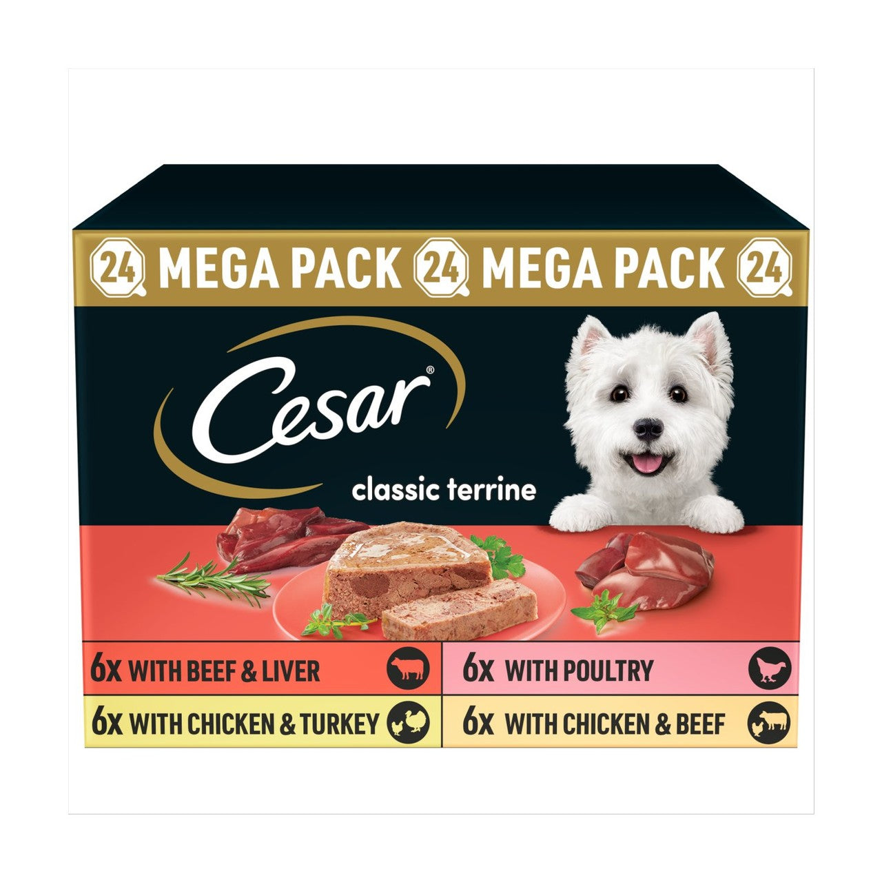Share enjoyable meals with your adult dog using the CESAR Classic Terrine Mixed Selection pack. This collection features four delicious, gently cooked recipes, ensuring variety and satisfaction for discerning palates. It is formulated to provide complete daily nutrition in an appealing texture.