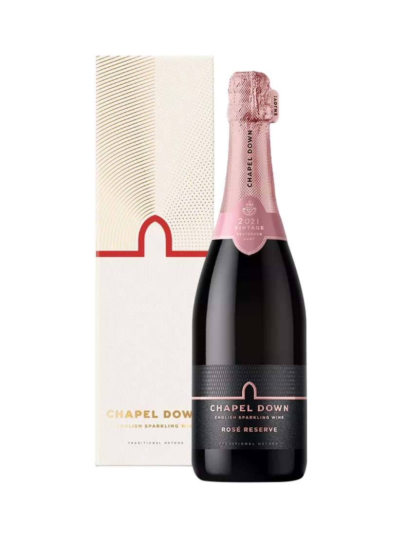 The award-winning Chapel Down Rosé Reserve 2021 is made from 96% Pinot Noir grape and matured on fine lees in tank for six months, before a further eighteen months ageing on lees in bottle before release. With aromas of wild strawberries, redcurrant and shortbread, this elegant rosé sparkling has a crisp, fresh palate and fine mousse.