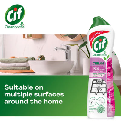Product InformationCif Pink Tuberose Cream Cleaner has 101 uses around your home, leaving virtually any hard surface sparkling clean with a fresh floral scent. From your kitchen to your bathroom, Cif multipurpose cleaner tackles challenges such as grease-encrusted hobs, muddy trainers or crayon drawings on the wall. The formula is tough on dirt and kind for your home, removing 100% of the toughest dirt with less rinsing. Keep your home beautifully clean and fresh with the UK's No. 1 Cleaning Cream Brand*. Apply to the surface using a damp cloth, then simply wipe over and gently rinse away. For a streak-free clean, wipe with a dry cloth. Always read the label before use. Do not use on linoleum, leather or textiles and avoid prolonged contact on painted wood and aluminium. For use on new/unusual surfaces, test on a small, inconspicuous area first. Our surface cleaner comes in a recycled plastic bottle. To ensure proper disposal, please drop the sleeve off at a soft plastic collection point, which can be found at some larger supermarkets. At Cif, we believe in revealing and protecting beauty for everyone to enjoy, every day. That's why Cif has developed a range of cleaning products that remove ugly dirt without damage. Providing you with beautiful results for over 50 years. *NIQ Data, Unit Sales, Household Cleaning (client defined) w/e 17/06/2023 (GB)