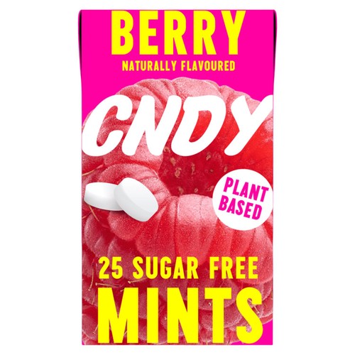 Discover the refreshment offered by CNDY Sugar Free Mints, packaged with 25 individual pieces. These confectionery items deliver a vibrant berry flavour profile derived from natural sources. This product is clearly branded as both plant based and completely free from added sugar for a lighter treat.