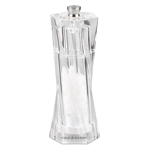 This Cole & Mason Aldeburgh set includes two 14cm mills crafted from clear acrylic. The smooth body is multiply faceted, creating a striking, modern look by refracting the visible contents. These mills instantly add contemporary style to your table and function as essential daily kitchen tools.