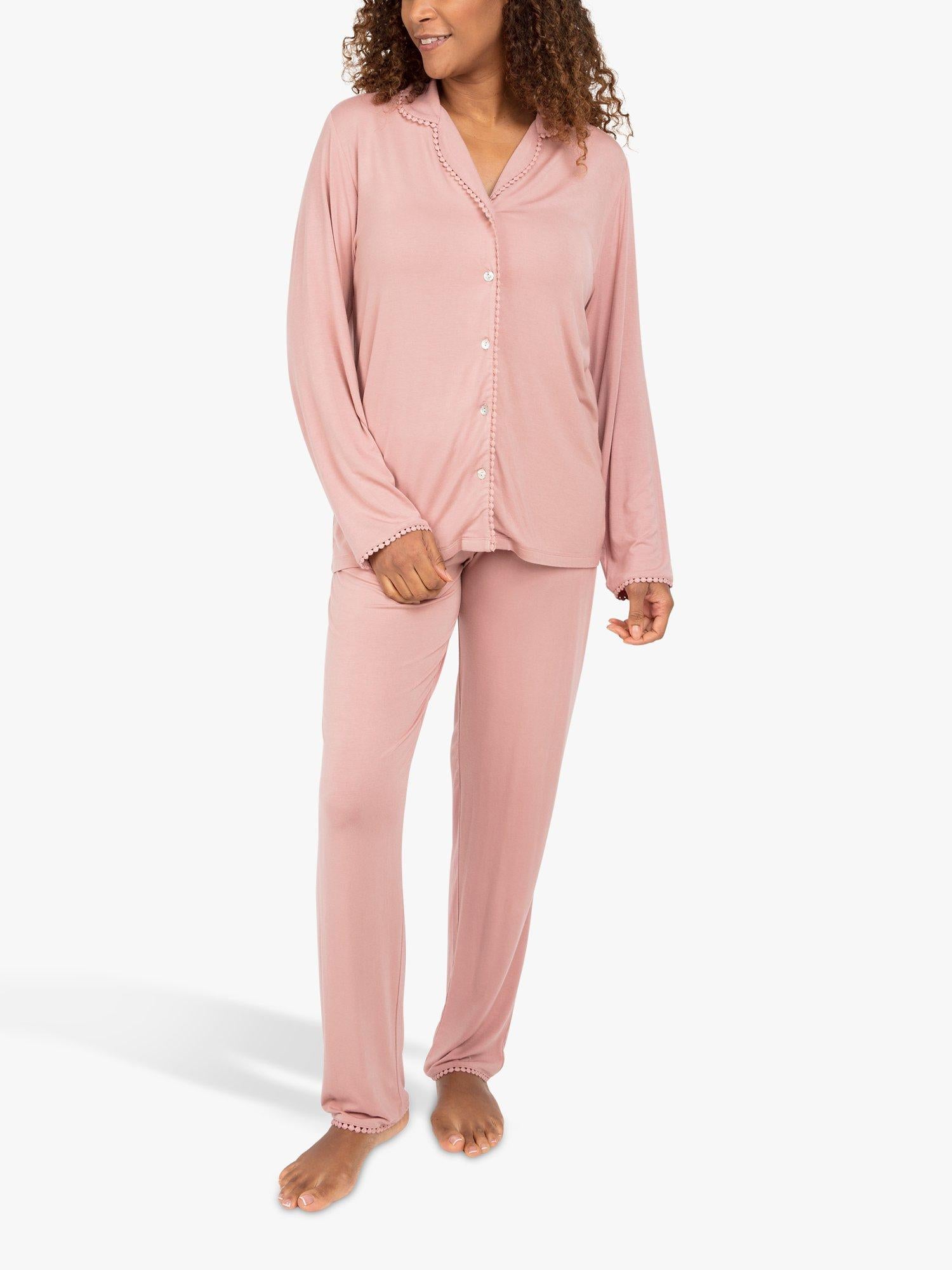 The Cyberjammies Audrey Jersey Pyjama Set in Rose is expertly engineered for superior weekend relaxation and deep sleep. This long-sleeve women's nightwear features a soft fabric blend, offering a truly comfortable experience throughout the entire night. Detailed with delicate lace trim, this set looks and feels excellent.