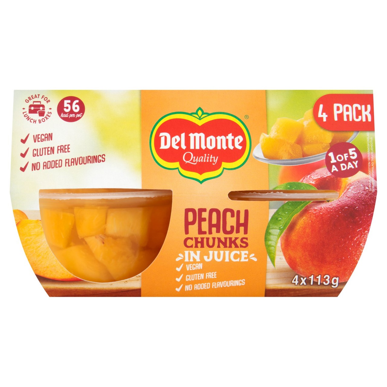 Del Monte Quality Peach Chunks provide a simple way to enjoy real fruit throughout your busy schedule. These sweet peach pieces are carefully packed in natural juice, offering a refreshing and highly accessible snack option. This multipack contains four individual 113g portions, making them ideal for straightforward portion control or quick additions to packed lunches.