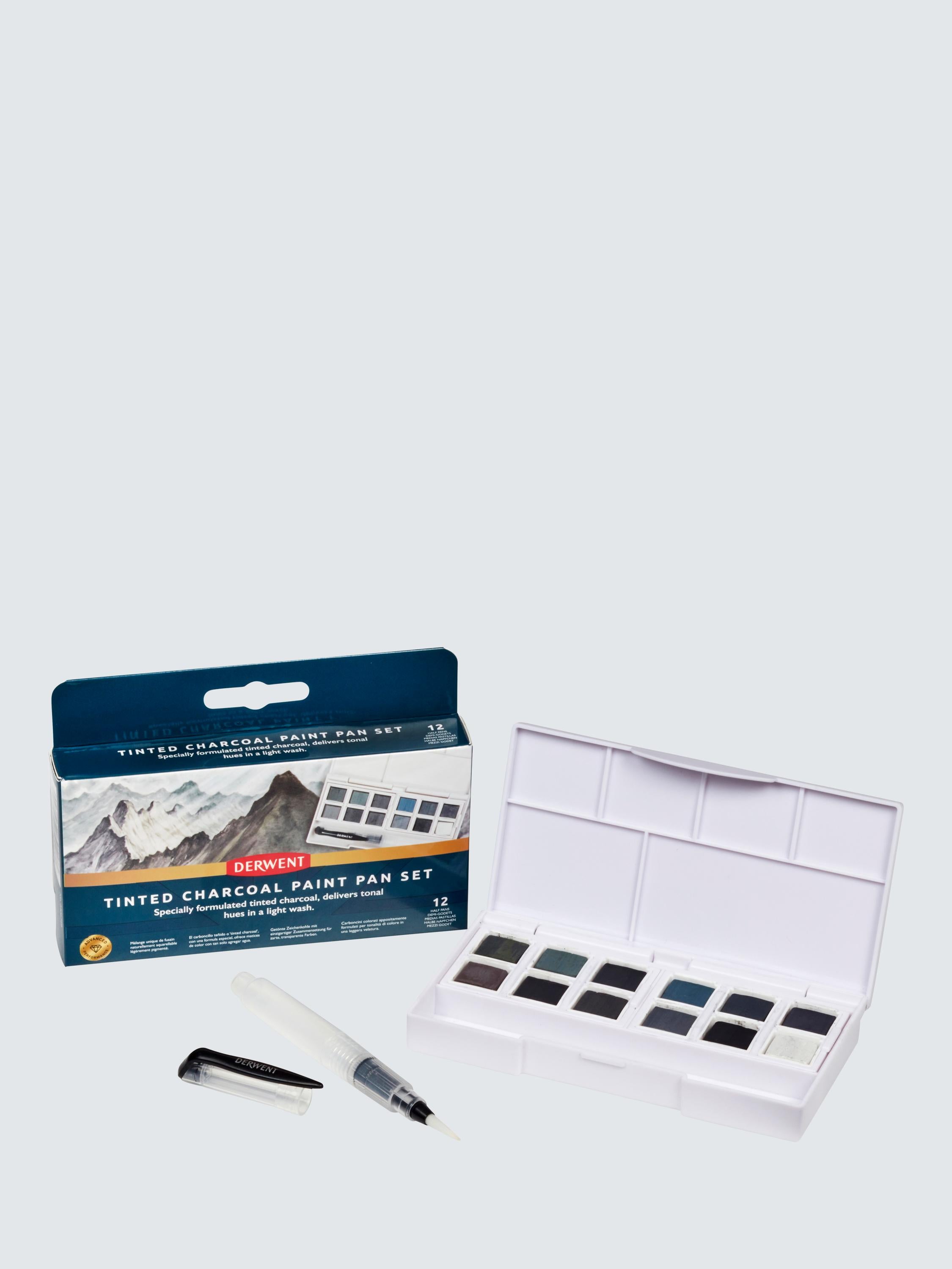 Discover Derwent Tinted Charcoal Paints Set of 12, offering a unique artistic medium for creative expression. These water-soluble paints blend the rich depth of charcoal with subtle colour tones. The set provides 12 muted shades and a vital white pan, enabling artists to achieve nuanced shading and effective highlights easily.