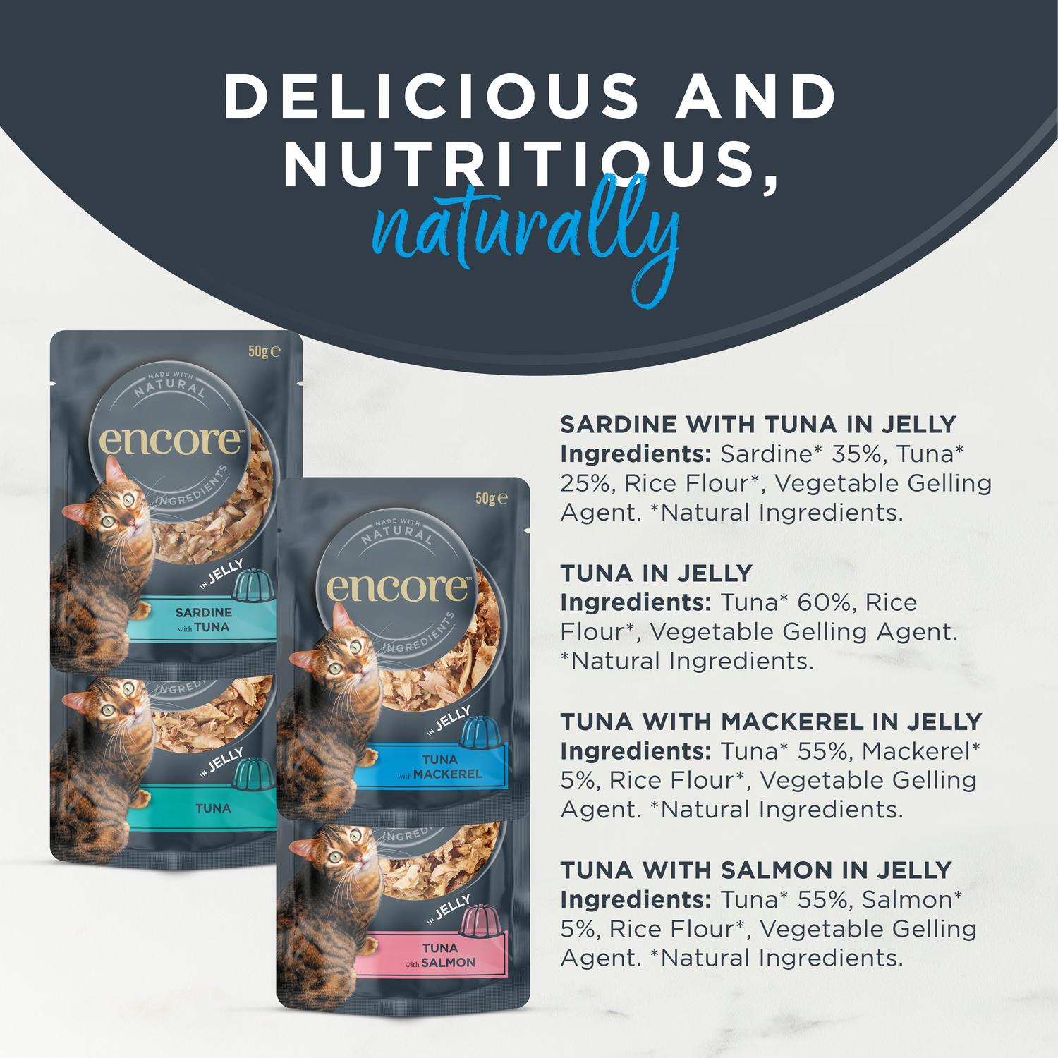 This Encore Fish Selection provides varied, appealing meals for adult cats within convenient 50g jelly pouches. It is specifically formulated as a complementary pet food meant to accompany a standard dry diet.