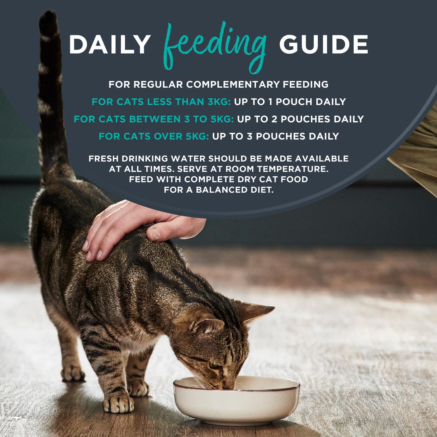 It doesn’t matter which of our fish selection pouches you serve first – your cat will love them all. Each handy pouch is filled with the finest natural ingredients, more real meat and rich in taurine. Feeding Guide: For regular complementary feeding. For cats less than 3kg: Up to 1 pouch daily. For cats between 3 to 5kg: Up to 2 pouches daily. For cats over 5kg: Up to 3 pouches daily. Fresh drinking water should be made available at all times. Serve at room temperature. Feed with complete dry cat food for a balanced diet. Analytical composition: Sardine with Tuna in Jelly: Protein 13%, Crude Fibre 0.1%, Crude Fat 1%, Crude Ash 1%, Moisture 83%. Tuna in Jelly: Protein 13%, Crude Fibre 0.1%, Crude Fat 1%, Crude Ash 1%, Moisture 83%. Tuna with Mackerel in Jelly: Protein 13%, Crude Fibre 0.1%, Crude Fat 2%, Crude Ash 1%, Moisture 82%. Tuna with Salmon in Jelly: Protein 13%, Crude Fibre 0.1%, Crude Fat 2%, Crude Ash 1%, Moisture 82%. Additives: None.
