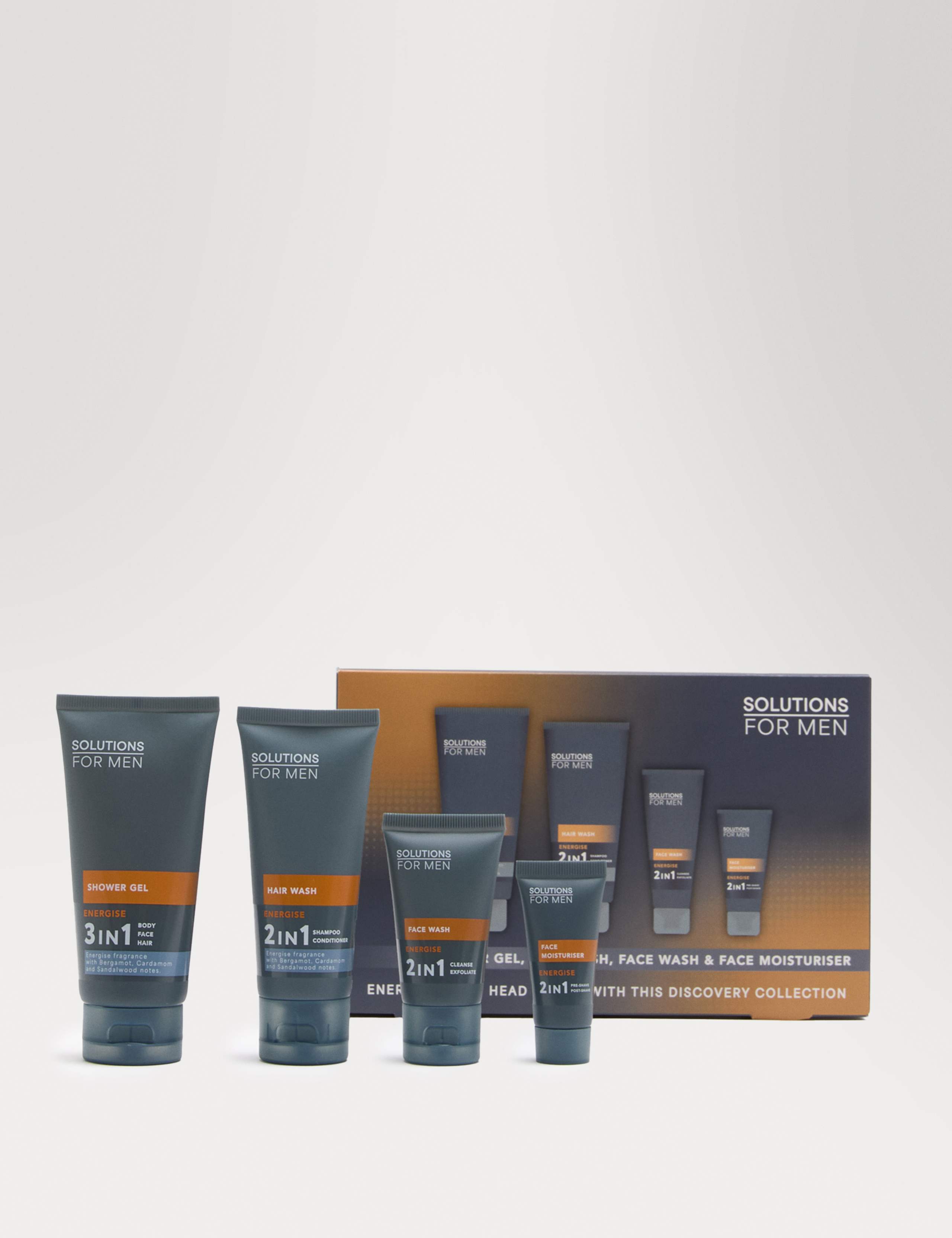 Read MoreRecharge their routine with the Energise discovery collection from our Solutions for Men range. This curated set has the face, hair and body covered with a selection of minis, all lightly scented with the revitalising blend of bergamot, cardamom and sandalwood. The 100ml shower gel works three ways, cleansing the body, face and hair. The 75ml hair wash is a time-saving two-in-one, both cleansing and conditioning with caffeine and niacinamide. For the face, the 30ml wash brings cleansing and exfoliation into one step, harnessing the power of caffeine and glycolic acid to promote smoother, brighter skin. To finish, a 15ml moisturiser doubles up as both a pre- and post-shave soother and moisturiser, calming the skin and reducing bumps.