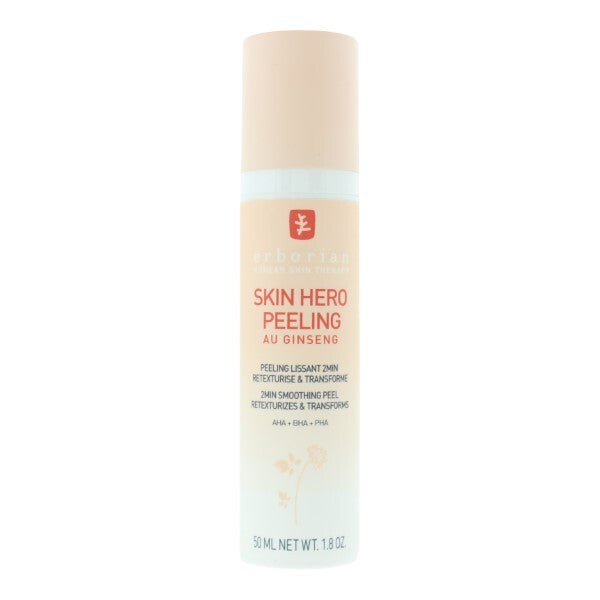 Erborian Skin Hero 2 Min Smoothing Peel is a poweful exfoliating Gel formulated with AHA, BHA, and PHA, to remove dead skin cells, refine texture, and unclog pores. Enriched with a unique complex of white ginseng, wild yam, liquorice, horsetail plant, and kigelia, it nourishes, soothes, and revitalizes your skin for a refreshed, luminous glow. Ideal for a quick yet effective skin renewal ritual.