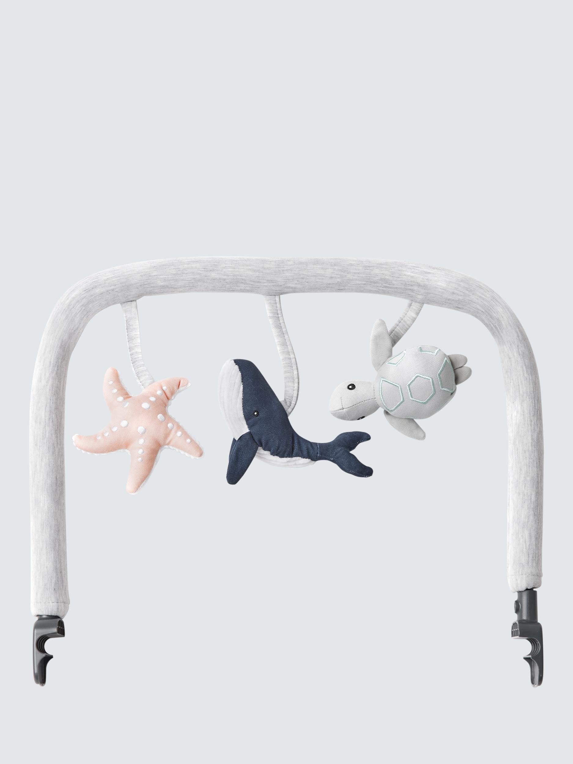 Ergobaby presents the Ocean Wonders Toy Bar accessory for the Evolve Bouncer. This attachment is designed specifically to keep infants happily engaged during playtime. The playful, ocean-themed components offer gentle, stimulating visual tracking exercises for young eyes. It supports early motor skill refinement right from birth. This quality addition enhances the bouncer experience significantly.