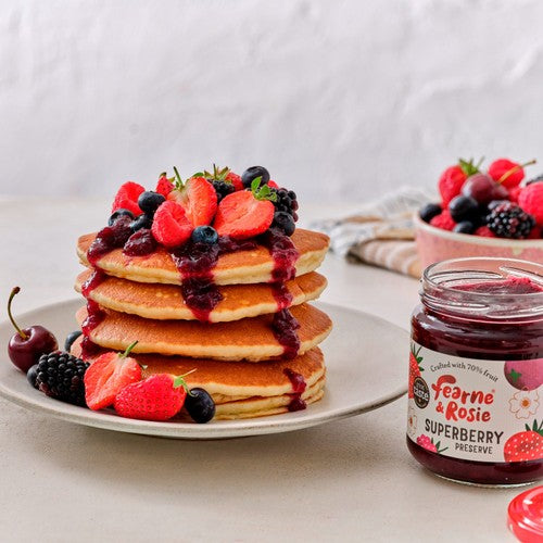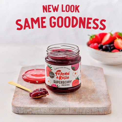 This Fearne & Rosie Superberry Jam offers a concentrated burst of fruit flavour with significantly reduced sugar content. It combines strawberries, raspberries, blueberries, and blackcurrants into a vibrant, naturally sweet spread. This award-winning jam provides a healthier way to enjoy your breakfast staples.