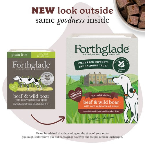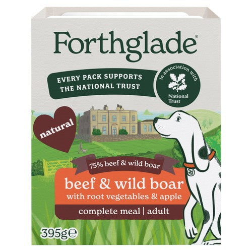 This Forthglade gourmet recipe combines beef and wild boar with root vegetables and apple for adult dogs over one year old. This complete pet food is gently steamed to ensure all the goodness and flavour are locked in during preparation. It offers dogs a nutritionally balanced meal for their daily requirements.