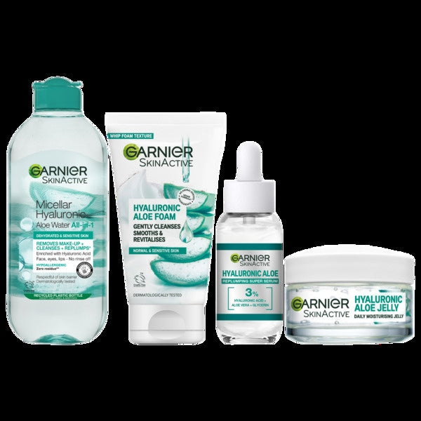 discover a intensely hydrating routine with garnier hyaluronic aloe bundle enriched with hyaluronic acid and aloe vera known for their replumping properties