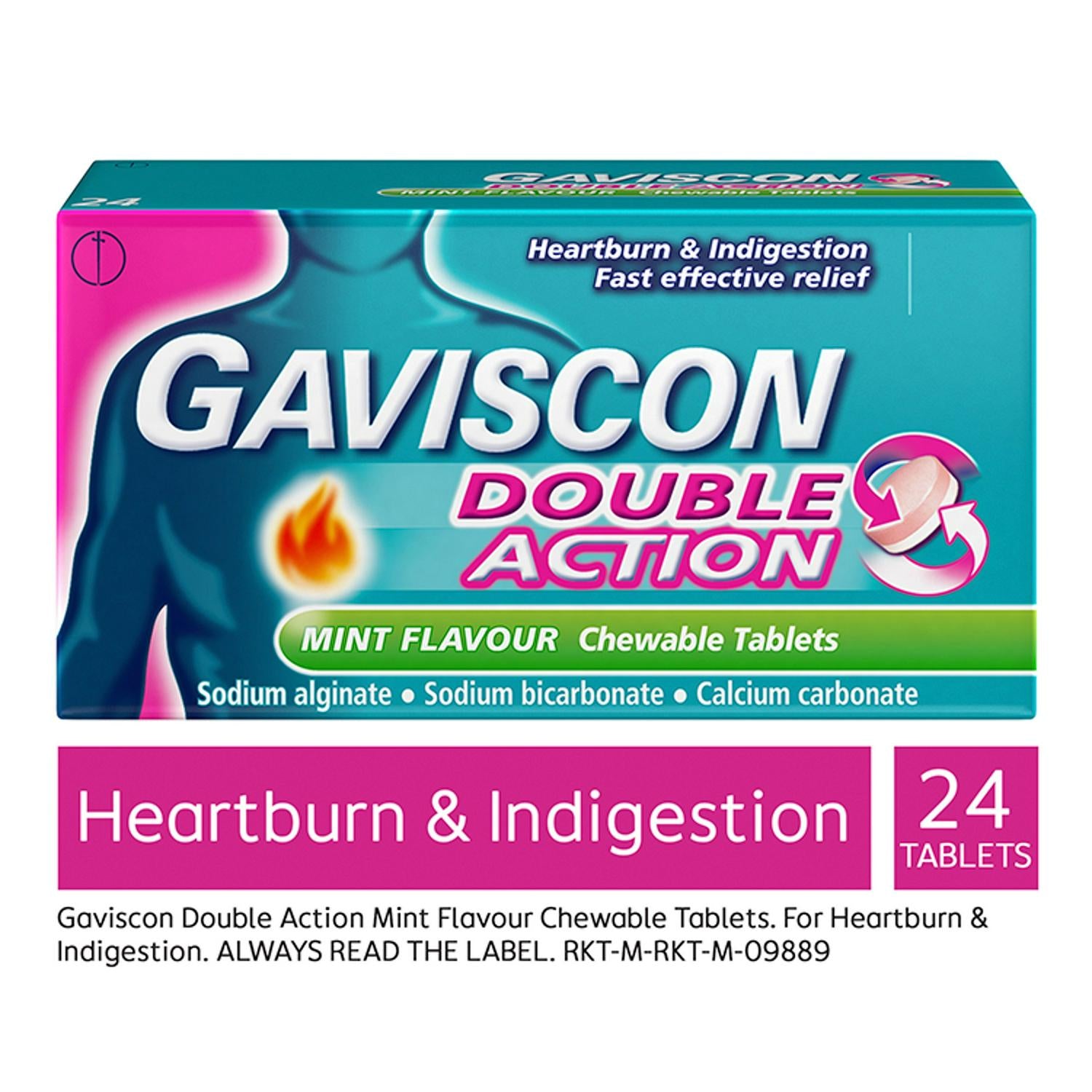 Gaviscon Double Action Mint Flavour Chewable Tablets bring long lasting relief from the pain and discomfort of heartburn and acid indigestion. They get to work in two different ways: