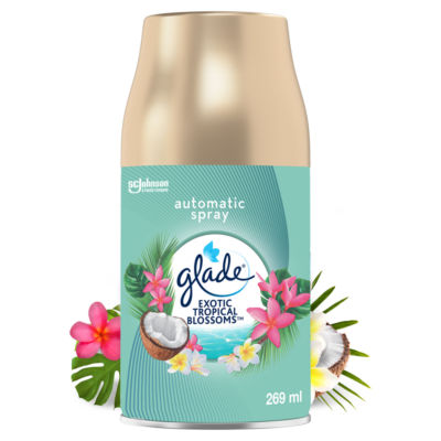 FeaturesTell your story with air and enjoy up to 2 months of fragrance with Glade automatic spray air freshener Glade uses a TrueScent Technology™, a proprietary blend of ingredients that provides a lasting feeling of clean Discover Glade automatic refill which has fragrance infused with essential oils made without phthalates, parabens, formaldehydes Switch things up with some flower power and boost the fragrance of any room with Glade battery operated air freshener Exotic Tropical Blossomswith notes of Monoi blossom, elderflower and coconut milk; Feel the perfect harmony with a fresh burst of air freshener spray every 9, 18 or 36 min for a timed fragrance release.