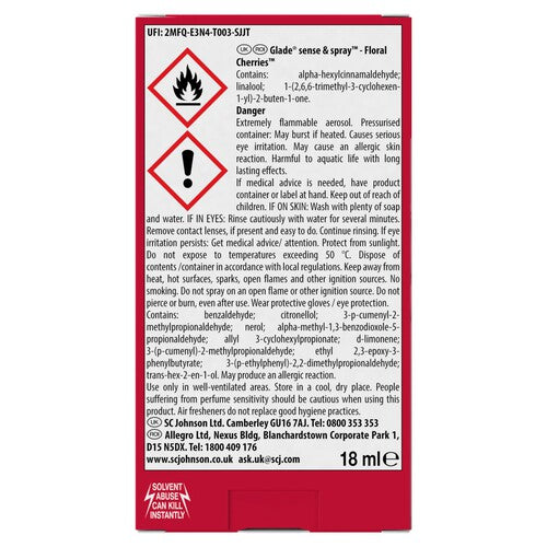 Experience positive vibes with the Glade Sense & Spray holder and refill in the Floral Cherries scent. This unique system functions as the only motion activated fragrance air freshener spray currently available. It utilises Glade’s TrueScent Technology to ensure a lasting impression of clean fragrance throughout your room.