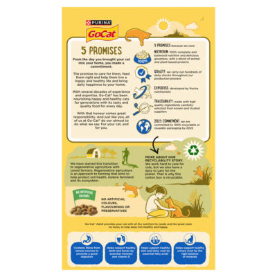 Product Information5 Promises because we care: Nutrition: 100% complete and balanced nutrition and delicious goodness, with a blend of animal and plant-based proteins Quality: we carry out hundreds of daily checks throughout our production process Expertise: developed by purina nutritionists Traceability: made with high quality ingredients carefully- selected from known and trusted suppliers 2025 commitment: we are committed to 100% recyclable or reusable packaging by 2025 Go-CatĀ® Adult provides your cat with all the nutrition he needs and the great taste he loves, to help keep him healthy and happy. Contains fibres from natural sources to promote a good digestion Helps support healthy teeth and bones by essential minerals and vitamin D Helps support healthy skin and shiny coat by essential fatty acids Helps support healthy urinary tract by the right balance of minerals