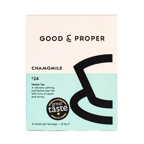 Good & Proper Chamomile teabags offer a naturally calming infusion with gentle flavour notes. This beverage features whole, yellow-gold blossoms that provide a sweet profile reminiscent of apple and honey. It is often enjoyed as a relaxing drink just before bedtime.