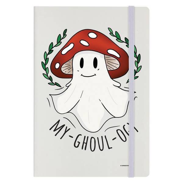 This Grindstore A5 notebook features a sturdy hard cover ideal for everyday use and creative writing. Measuring 21cm high by 14cm wide, this paper-based journal is perfectly sized for portability. The design theme incorporates playful elements like ghosts, leaves, and mushrooms for a distinct aesthetic appeal. Keep your notes secure with the included elastic fastener when you are not using this essential stationery item.