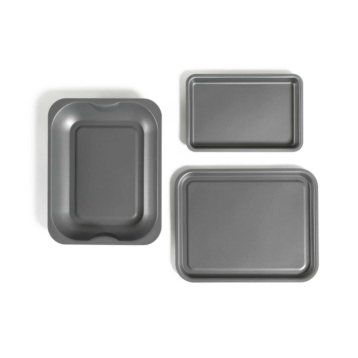 Read MoreWho's aching for baking? This sensible non-stick carbon steel bakeware set has all your basics covered. A large roasting tin for meat and veg, that's Sundays sorted. And 2 handy trays, ideal for everything from scones to oven chips. Plus, the non-stick coating inside and out makes washing up easy. The set comprises: 2 trays at just over 12 and 15 long and a roasting tin at 15-inches long.