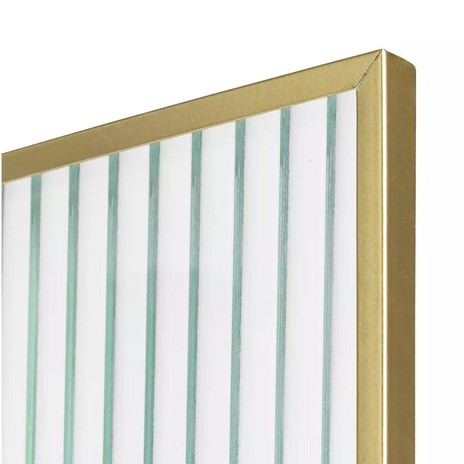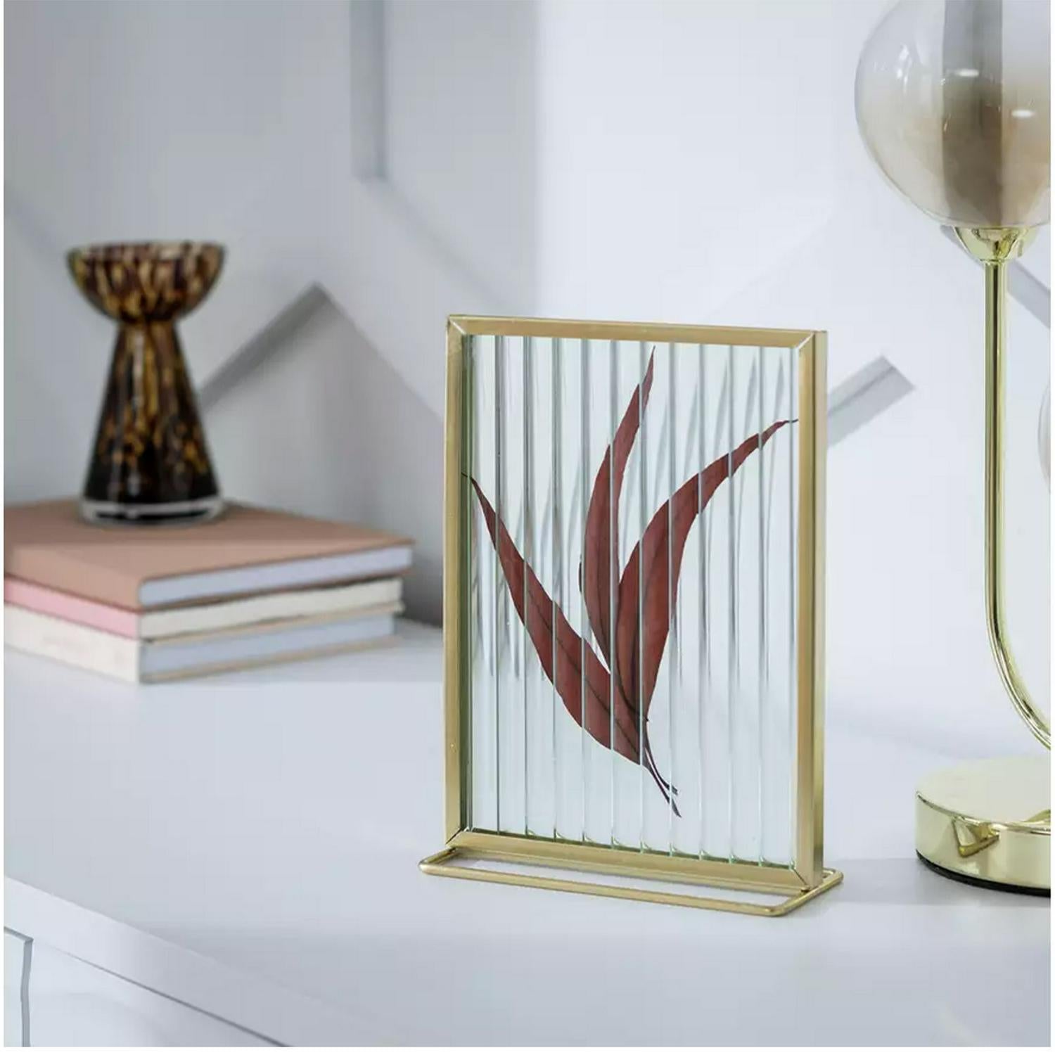 This Habitat frame combines distinctive reeded glass and golden steel components for an artistic presentation. This freestanding photo frame offers an elegant, retro aesthetic blended with modern lightness, perfectly showcasing your chosen image insert. It is built to create an immediate focal point in any room.