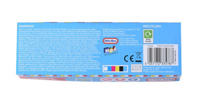 SOUND & LIGHT. DEVELOPS HAND-EYE COORDINATION,FINE MOTOR SKILLS & MORE. WARNING This toys produces flashes that may trigger epilepsy in sensitised individuals. ONLY AN ADULT SHOULD REPL ACE THE BATTERIES. An Adult should secure the battery compartment screw before giving the toy to a child. Insert batteries correctly with the correct polarity (see markings), Non-rechargeable batteries are not to be recharged. Use only batteries of the same or equivalent type as recommended. Rechargeable batteries are to be removed from the toy before being charged. Rechargeable batteries are only to be charged under adult supervision. The batteries included are for demonstration purposes. Low or flat batteries can cause deterioration in the sound quality. Slow or distorted sound can be restored by replacing the batteries. Warning: Remove and retain packaging safely before giving this toy to children. USE 2 x AA (1.5V) BATTERIES INCLUDED. ONLY AN ADULT SHOULD REPLACE THE BATTERIES. Care instructions: Wipe clean with a soft damp cloth. Instructions for use: Use under direct adult supervision. Completely remove all plastic ties and packaging attachments before giving this toy to children. The age recommendations are for your guidance. Always review the development & capabilities of the child and his/her suitability to play with this toy. Please examine the toy regularly for wear before giving it to a child. Discard or replace if the item is damaged. To avoid the danger of suffocation, keep any bags or packaging away from babies and children. Any packaging or bags are not part of the toy and must be disposed of immediately before using the toy. Conforms to EN71. Please retain this information for future reference.