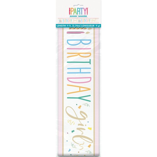 This 9ft foil banner helps make the birthday girl feel especially celebrated. It features a glamorous design in pink, white, pastels, and gold tones. This decoration is easily displayed across walls, used as a party backdrop, or hung over an entrance.