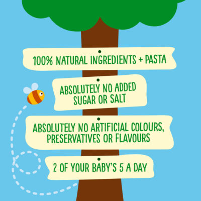 Features100% natural ingredients + pasta. 2 of your baby's 5 a day. Absolutely no added sugar or salt. Absolutely no artificial colourings, preservatives or flavours.