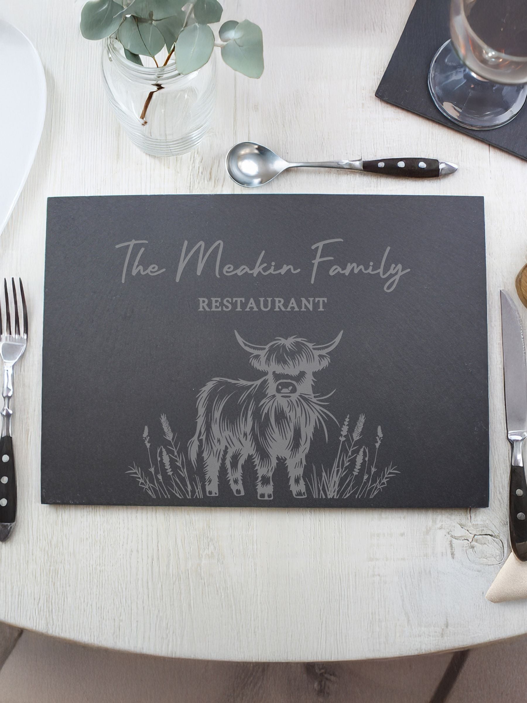Add a personal touch to your dining table with our personalised Highland Cow Slate Rectangle Placemat. Perfect for meals or as a decorative piece, this placemat features a unique Highland cow design and can be personalised with a special message over two lines. You can add up to 30 characters on each line. For Line 1, please avoid using all caps as the font looks best in lowercase. Line 2 will appear in fixed UPPERCASE for a bold, clear finish. Please note, each slate piece is cut by hand, making every placemat unique. Due to the natural variations in slate, you may notice differences in texture, cut, and smoothness, including slight imperfections, flaking, or uneven corners – all adding to the charm and character of the piece. Dimensions: Height 21.2 cm, Width 29.7 cm, Depth 0.5 cm. A beautiful and personal gift that’s perfect for any occasion!