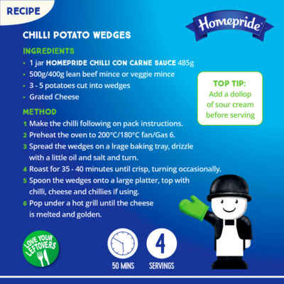 Your Shopping List - Serves 4500g jar Homepride Chilli sauce500g of lean minced leafHow to make1. Brown your minced beef for at least 5 minutes until juices run clear.2. Stir in a jar of your sauce and simmer for 15-20 minutes until cooked through.Please ensure food is fully cooked and piping hot throughout before serving.3. Enjoy with rice and your family.