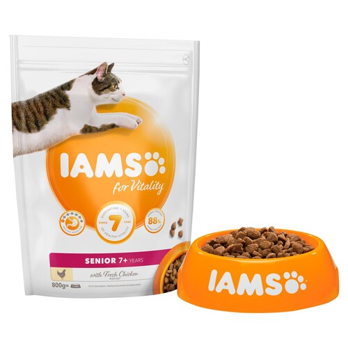 IAMS for Vitality Senior Cat Food offers complete expert nutrition formulated with fresh chicken for older cats. This recipe is designed to nourish your cat's healthy vitality throughout their senior years.