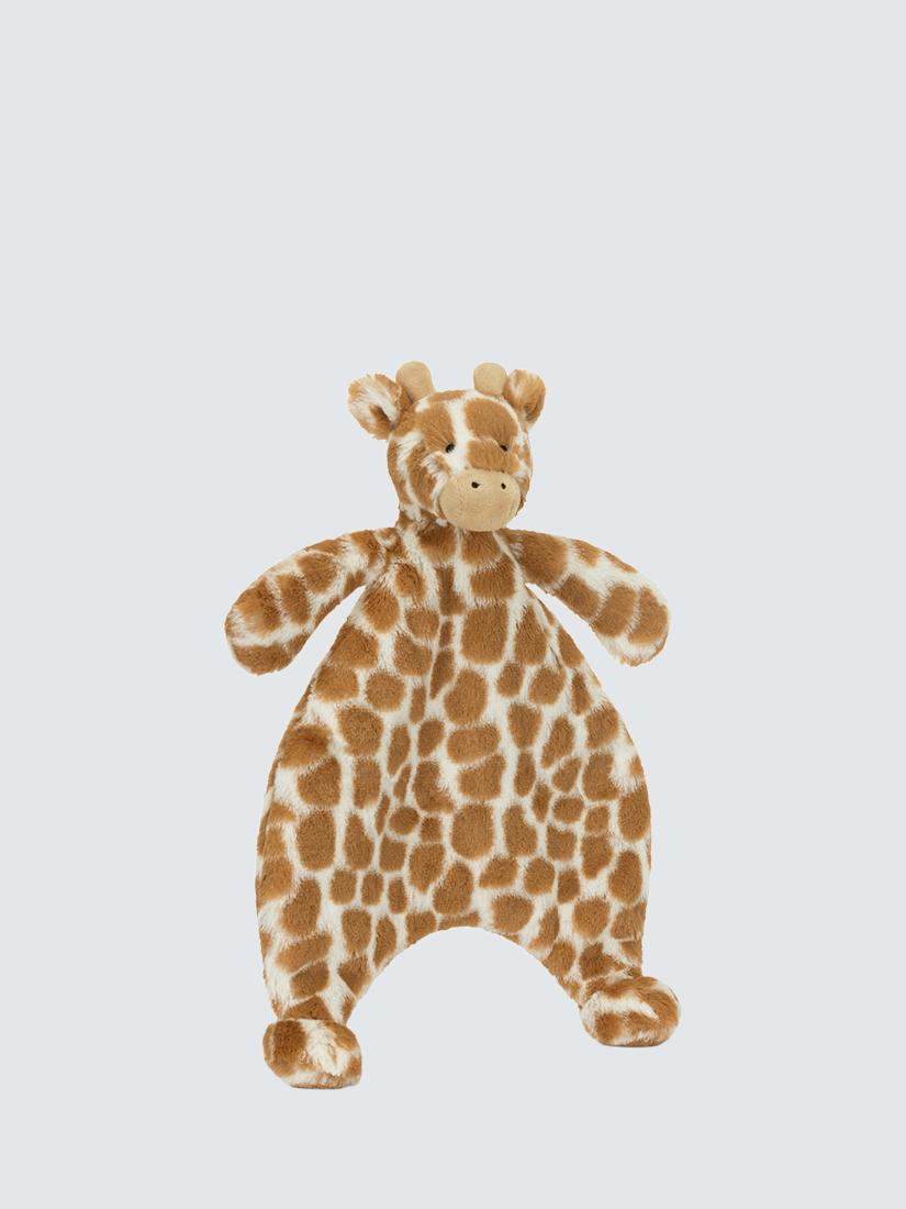 Bashful Giraffe Comforter is the perfect cuddling companion. Shaped like Bashful Giraffe in iconic patterned Bashful fur created from recycled fibres, little ones can hold on to the giraffe's hand, or cuddle into an unstuffed tummy for joyful journeys and soothing sleeps.