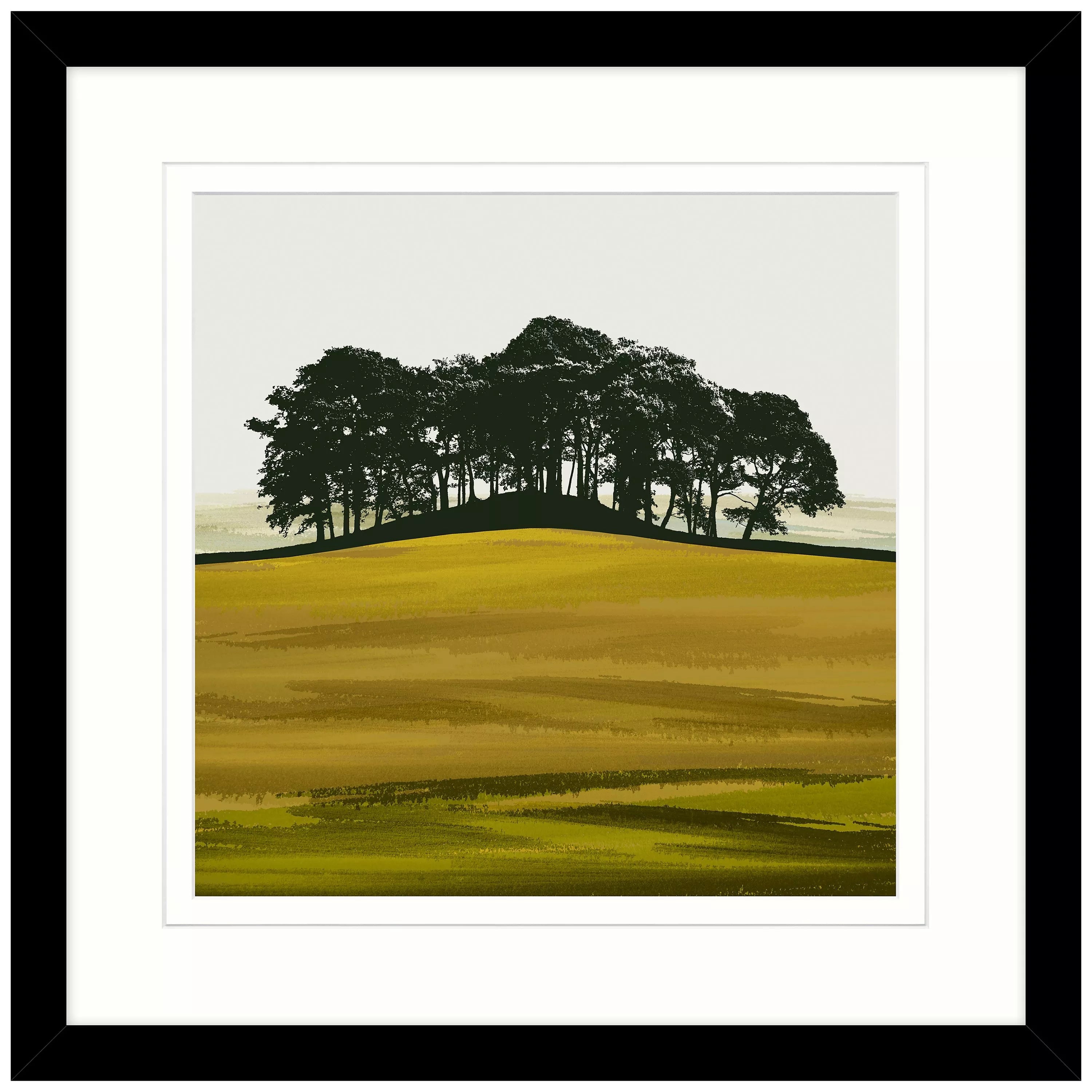 The might of these tall trees is highlighted by the simplicity of this technique. A bold black cut out is contrasted with the bright white background, drama is added with the a green block of colour. The print is presented in a beautiful scored mount, emphasising the print, and is in a decorative MDF wrapped frame that was a contemporary black grained wood finish.