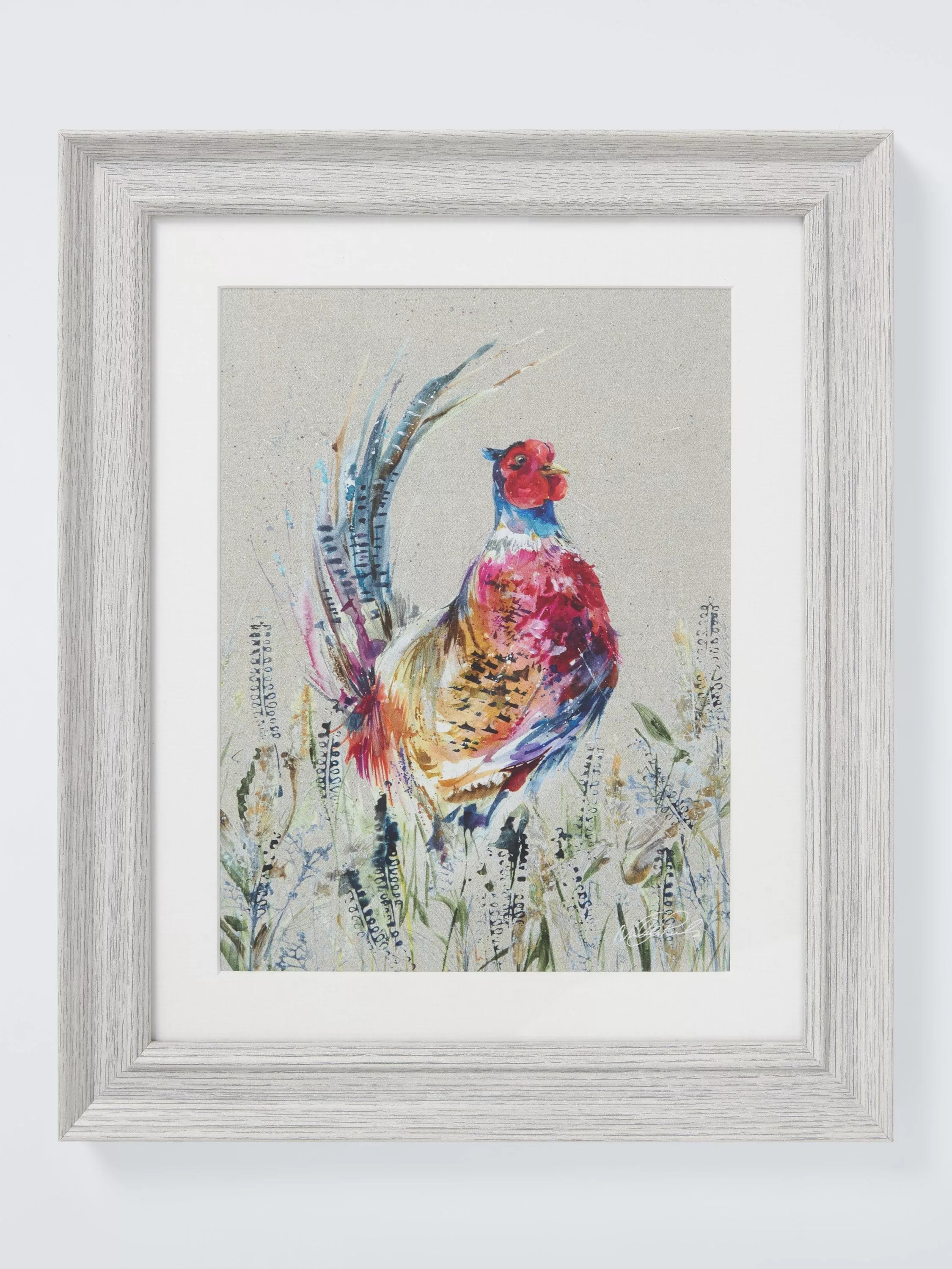 'Pheasant' artwork by artist Nicola Jane Rowles. Made in the UK, this glazed print is presented with a window mount in a grey wood-effect frame, ready to hang on your wall.