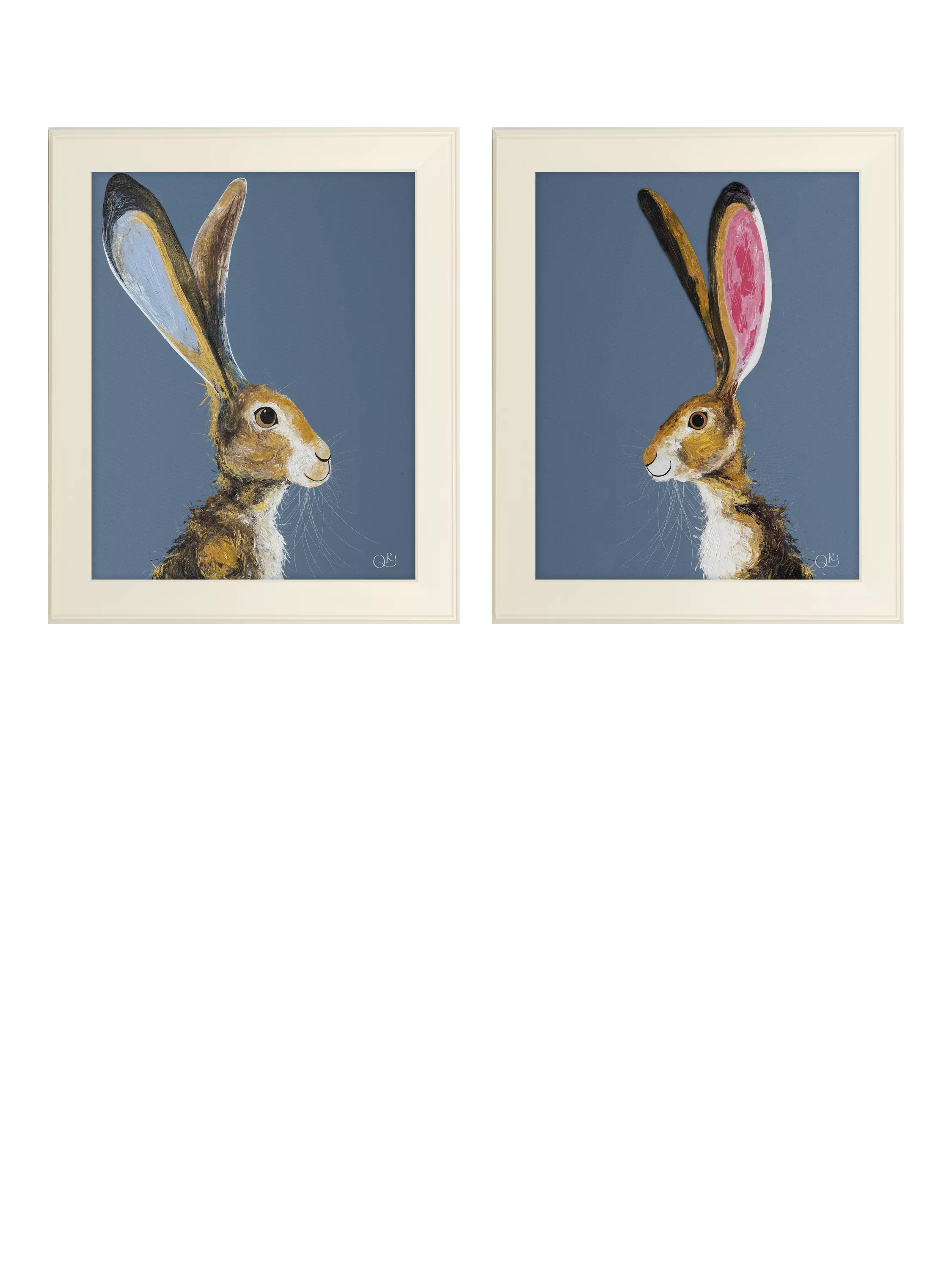 A pair of framed prints, 'Aurora' and 'Harry' by artist Quinn Russell. Made in the UK, these unglazed prints are finished with a hand-applied artist's texture gel and are presented in cream-coloured frames, ready to hang on your wall.