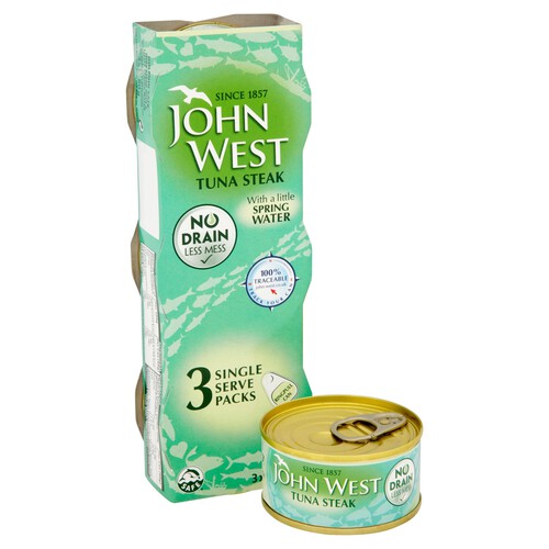 Enjoy convenient preparation with John West No Drain Tuna Steak, packed in pure spring water for a clean, lighter flavour profile. This product delivers high-quality tuna steaks that are ready for immediate use in all your favourite home recipes. Its innovative no drain format significantly reduces mess and speeds up cooking times for busy schedules.